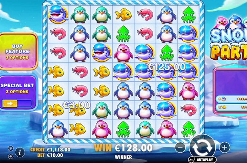 Dyk ned i Snow Party, hvor havdyr fylder et 7×7-gitter. Klynger af 5 eller flere ens symboler giver gevinster, og større kombinationer øger præmierne. Med farverigt design og dynamisk gameplay giver hvert spin underholdning og chancen for at vinde op til 1.250x.