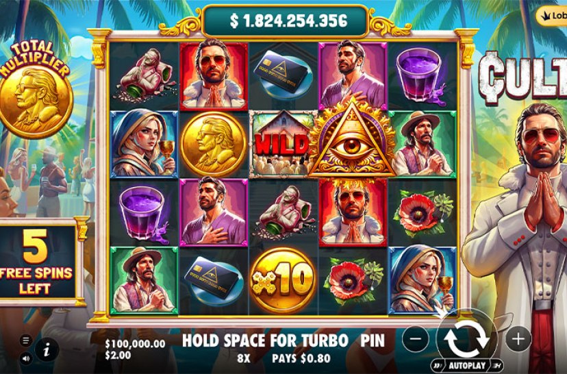 CULT by Pragmatic Play is a dark 5×4 slot where multiplier wilds can reach values of up to 100x. Landing three to five scatters unlocks free spins, while winning multipliers combine into a growing total multiplier. As the feature progresses, every new win builds the potential further, creating an intense experience where escalating power drives each spin.
