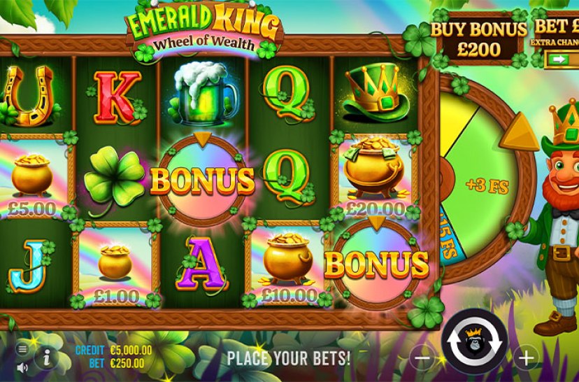 Jag heldet i Emerald King – Wheel of Wealth, en 5×3-slot med irsk tema. Bonus-symboler udløser Gratis Spins, mens lykkehjulet kan give op til 20 ekstra spins.
