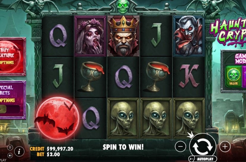 Haunted Crypt by Pragmatic Play invites you into a chilling 5×3 adventure filled with electrifying multiplier wilds and eerie free spins. Choose between Value and Speed modes, with Speed increasing your chances of triggering the bonus. Wilds can boost wins up to 10x in the base game, while three scatters unlock 10 thrilling free spins inside the crypt.