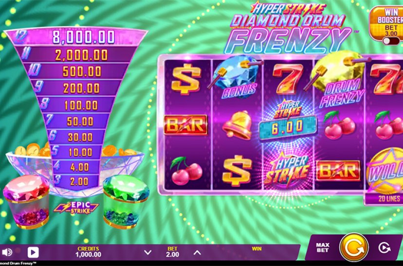 Turn up the tempo in Hyper Strike Diamond Drum Frenzy™, where diamond beats meet drum-powered wins. This high-energy slot blends Hyper Strike™ action with Drum Frenzy™ mechanics, delivering nonstop excitement and win potential up to 5,000x. The Epic Strike™ feature returns with instant Cash Prizes, rewarding players the moment enough symbols land.
